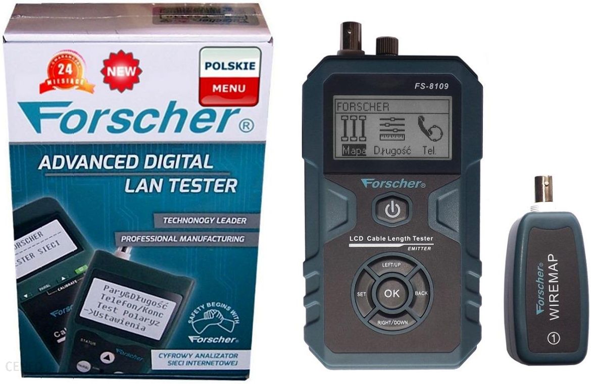 MIERNIK TESTER LAN FORSCHER FS8109 POENajważniejsze cechySposób połączenia konkretnych żył kabla,Pomiar długość kabli Internetowych i koncentrycznych 10-2000m.Uszkodzenie kabla tzn: zwarcia, rozwarcia, odwrotne połączeniaLokalizacja odległości do uszkodzeniaTest Stanu linii telefonicznychPodświetlany wyświetlaczOpisTester sieci internetowej FS8109 służy do pomiaru ciągłości okablowania , pomiaru długości przewodów oraz pomiaru odległości do uszkodzenia , pomiaru napięć (POE) Umożliwia pomiar błędów połączeń w skrętkach UTP/STP ,oraz test lini telefonicznych. Funkcja „Znajdź Port” do szybkiej lokalizacji portu w urządzeniu sieciowym spotykana jedynie w zaawansowanych testerach sieciowych FLUKE Cable IQ / MicroscannerMenu w języku Polskim lub AngielskimIdentyfikacja portu routera (hub , switch) „Port Flash”Pomiar napięć na poszczególnych żyłach (POE)Test integralności parVFL – wizualny tester przewodów optycznych (Visual Fault Locator)Zapamiętanie wyników pomiaru w pamięci urządzeniaAutomatyczne wyłącznie przy bezczynności – czas wyłączenia ustawiany przez użytkownika